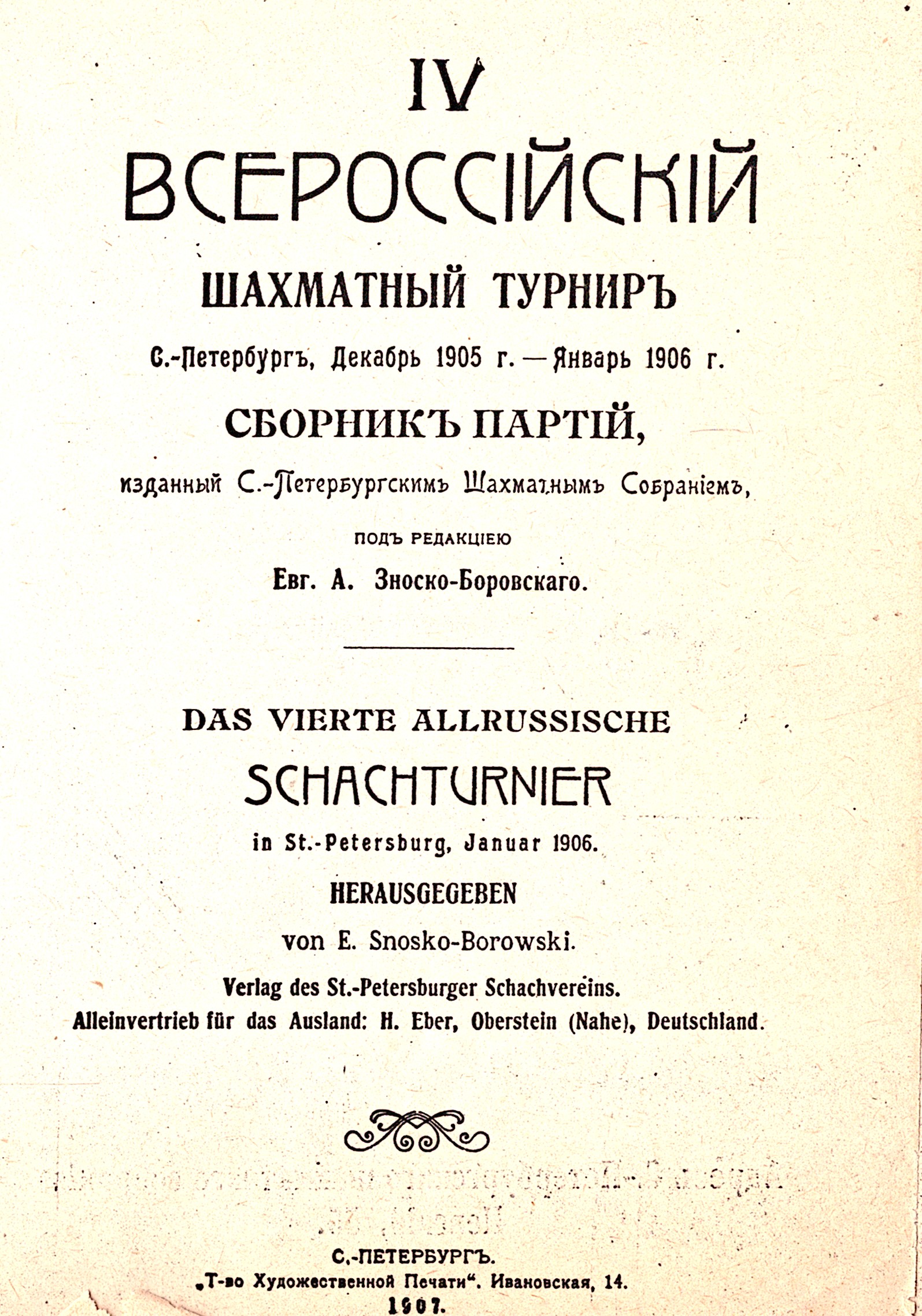Всероссийский шахматный турнир (4 ; 1906 ; Санкт-Петербург). IV Всероссийский шахматный турнир : декабрь 1905 г. - январь 1906 г. : сб. партий, изданный С.-Петерб. шахмат. собранием под ред. Е. А. Зноско-Боровского. - СПб. : Т-во художеств. печати, 1907. - 214 с. - Тираж не указ. - Б. ц. - Текст : непосредственный.
