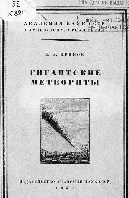 Кринов, Евгений Леонидович (российский геолог ; 1906-1984). Гигантские метеориты : (Тунгусский и Сихотэ-Алинский) / Е. Л. Кринов, лауреат Сталинской премии ; Академия наук СССР. - Москва : Изд-во Академии наук СССР, 1952. - 91, [4] с. : ил. - (Научно-популярная серия). - Библиогр. в конце кн. - 10000 экз. - Текст : непосредственный.