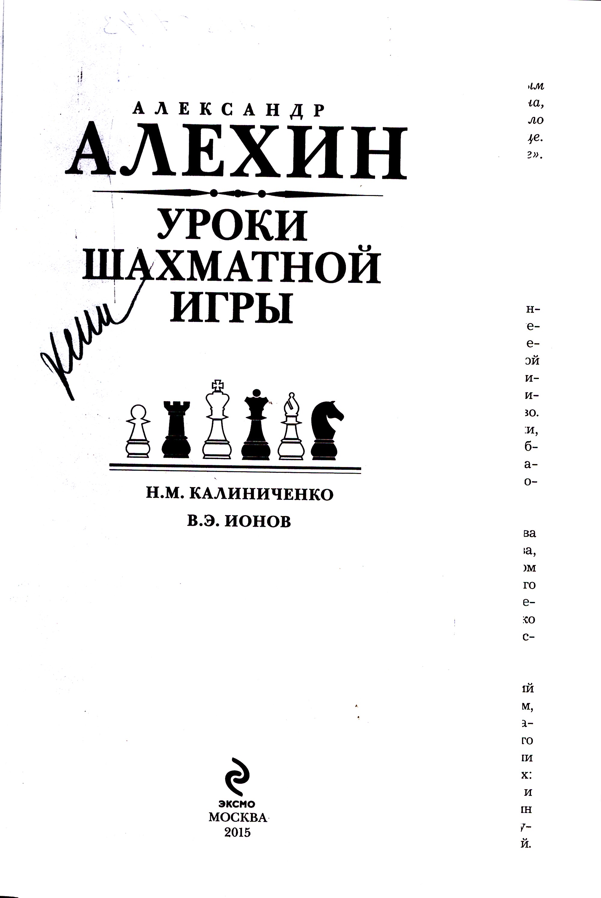 Калиниченко, Н. М. Александр Алехин. Уроки шахматной игры / Н. М. Калиниченко, В. Э. Ионов. - М. : ЭКСМО, 2015. - 702 с. : ил. - (Шахматы. Классики). - Библиогр.: с. 699. - 2000 экз. - ISBN 978-5-699-71636-4 : Б. ц. - Текст : непосредственный.