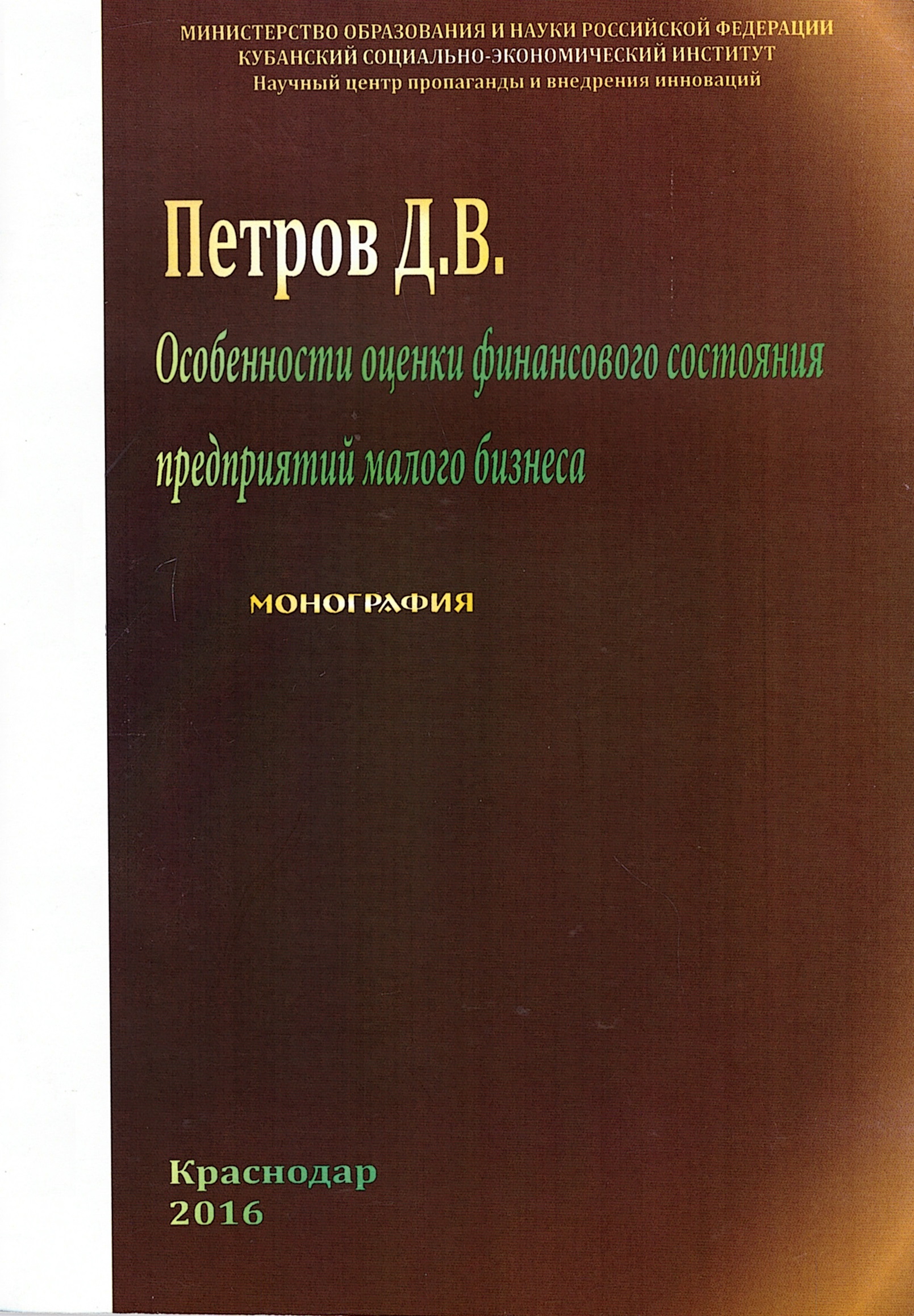 Петров, Д. В. Особенности оценки финансового состояния предприятий малого бизнеса : монография / Д. В. Петров ; Куб. соц.-экон. ин-т, Науч. центр пропаганды и внедрения инноваций. - Краснодар : КСЭИ, 2016. - 100 с. : ил. - Библиогр.: с. 94-99 (69 назв.). - 1000 экз. - ISBN 978-5-91276-146-1 : 260 р. - Текст : непосредственный.