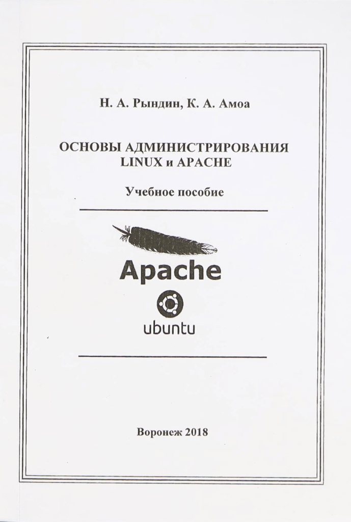 Рындин, Н. А. Основы администрирования Linux и Apache : учебное пособие / Н. А. Рындин, К. А. Амоа ; Министерство образования и науки Российской Федерации, Воронежский государственный технический университет. - Воронеж : Воронеж. гос. техн. ун-т, 2018. - 186 с. : ил. - Библиогр.: с. 181-183 (32 назв.). - 350 экз. - ISBN 978-5-7731-0652-4 : 200 р. - Текст : непосредственный.