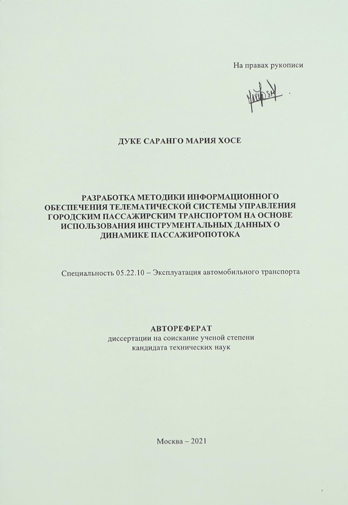 Дуке Саранго, Мария Хосе. Разработка методики информационного обеспечения телематической системы управления городским пассажирским транспортом на основе использования инструментальных данных о динамике пассажиропотока : специальность 05.22.10 - Эксплуатация автомобильного транспорта : автореферат диссертации на соискание ученой степени кандидата технических наук / Дуке Саранго Мария Хосе ; Московский автомобильно-дорожный государственный технический университет (МАДИ), Кафедра "Транспортная телематика". - Москва : [б. и.], 2021. - 23 с. : ил. - Библиогр.: с. 22-23 (9 назв.). - 100 экз. - Текст : непосредственный.