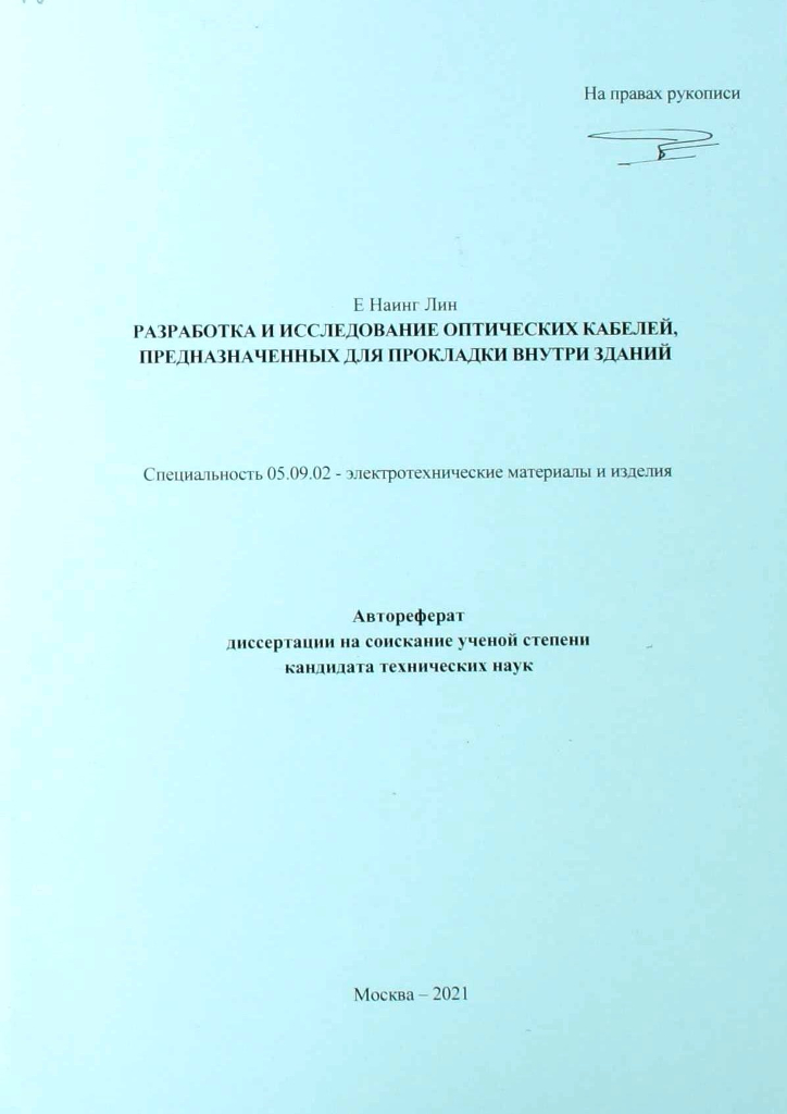 Е Наинг Лин. Разработка и исследование оптических кабелей, предназначенных для прокладки внутри зданий : специальность 05.09.02 - Электротехнические материалы и изделия : автореферат диссертации на соискание ученой степени кандидата технических наук / Е Наинг Лин ; Национальный исследовательский университет "МЭИ". - Москва : [б. и.], 2021. - 20 с. : ил. - Библиогр.: с. 19-20 (10 назв.). - 50 экз. - Текст : непосредственный.