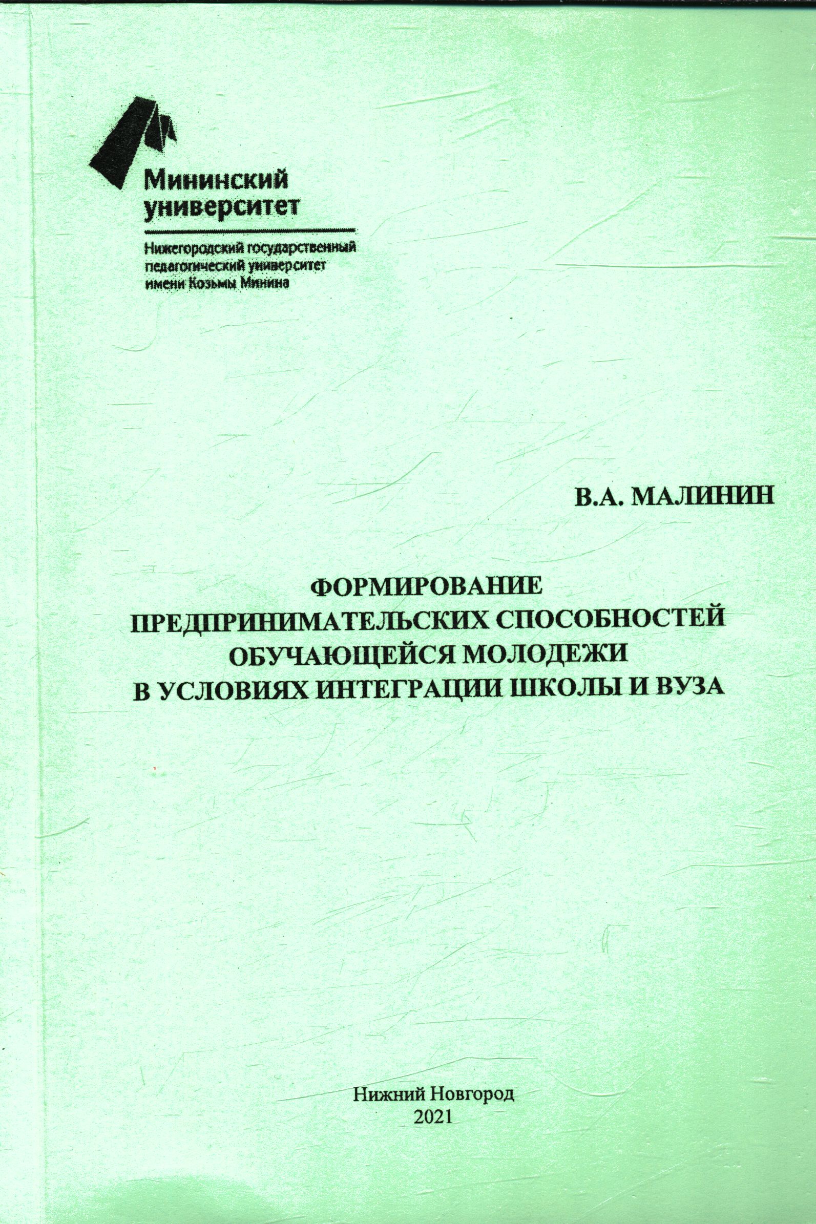 Малинин, Валерий Анатольевич. Формирование предпринимательских способностей обучающейся молодежи в условия интеграции школы и вуза : учебное пособие / В. А. Малинин ; Министерство просвещения Российской Федерации, Нижегородский государственный педагогический университет имени Козьмы Минина (Мининский университет). - 2-е изд., перераб. - Нижний Новгород : Мининский ун-т, 2021. - 139 с. - Библиогр.: с. 136-139 (30 назв.). - 1000 экз. - ISBN 978-5-85219-776-4 : 200 р. - Текст (визуальный) : непосредственный.