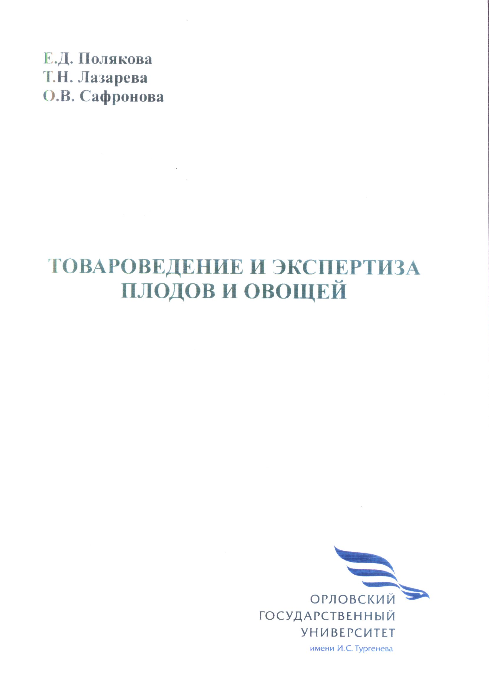 Полякова, Елена Дмитриевна. Товароведение и экспертиза плодов и овощей / Е. Д. Полякова, Т. Н. Лазарева, О. В. Сафронова ; Министерство науки и высшего образования Российской Федерации, Орловский государственный университет имени И. С. Тургенева. - Орёл : ОГУ им. И. С. Тургенева, 2021. - 163 с. : ил. - Библиогр.: с. 153-154 (11 назв.). - 100 экз. - ISBN 978-5-9929-1136-7 : 150 р. - Текст (визуальный) : непосредственный.