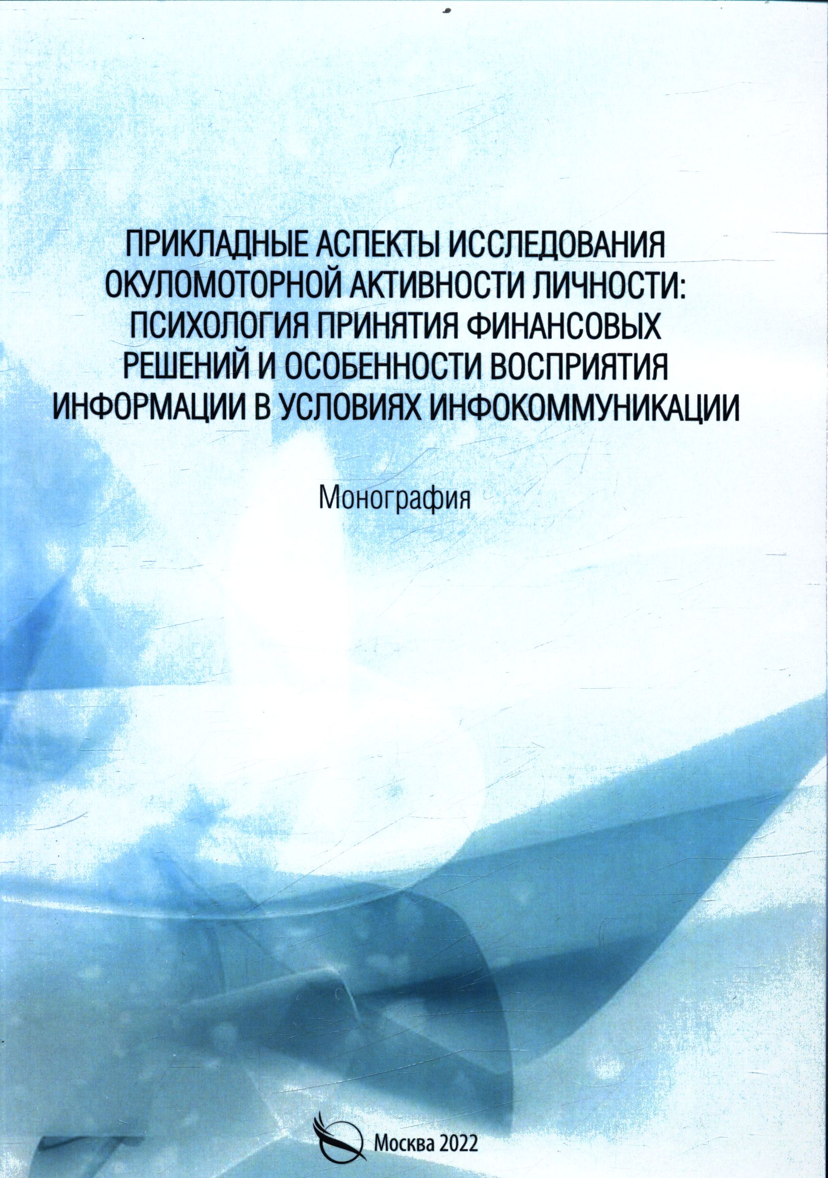 Белых, Татьяна Викторовна. Прикладные аспекты исследования окуломоторной активности личности: психология принятия финансовых решений и особенности восприятия информации в условиях инфокоммуникации : монография / Т. В. Белых. - Москва : Перо, 2022. - 137 с. : ил. - Авт. указ. в макете аннот. карт. - Библиогр.: с. 119-125 (86 назв.). - 200 экз. - ISBN 978-5-00204-760-4 : 200 р. - Текст (визуальный) : непосредственный.