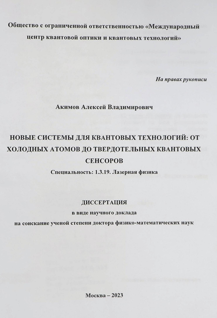Акимов, Алексей Владимирович. Новые системы для квантовых технологий: от холодных атомов до твердотельных квантовых сенсоров : специальность: 1.3.19 "Лазерная физика" : диссертация в виде научного доклада на соискание ученой степени доктора физико-математических наук / Акимов Алексей Владимирович ; Общество с ограниченной ответственностью "Международный центр квантовой оптики и квантовых технологий". - Москва : [б. и.], 2023. - 69 л. - Библиогр.: с. 40-69 (106 назв.). - Тираж не указ. - 200 р. - Текст (визуальный) : непосредственный.