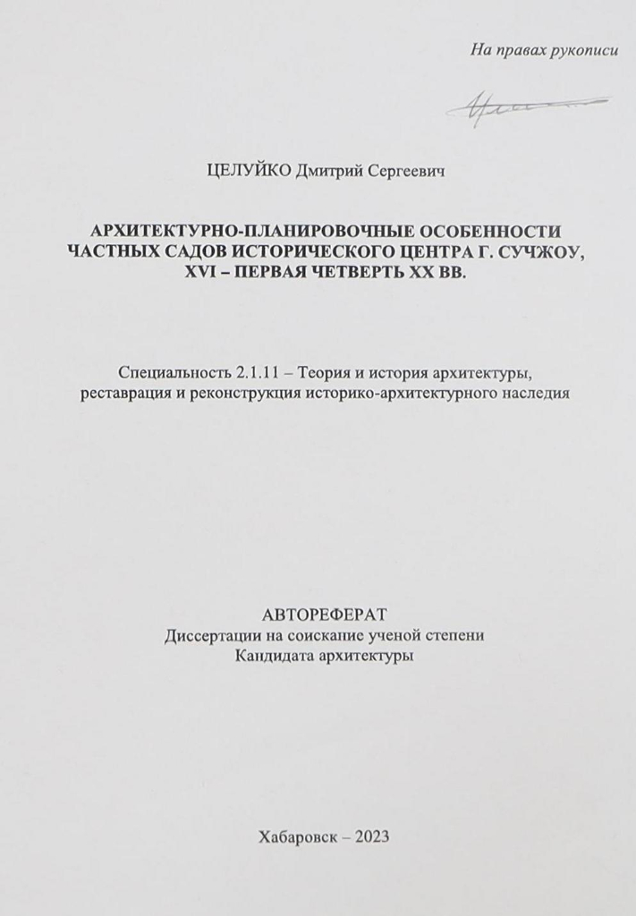 Целуйко, Дмитрий Сергеевич. Архитектурно-планировочные особенности частных садов исторического центра г. Сучжоу, XVI - первая четверть XX вв. : специальность 2.1.11 - Теория и история архитектуры, реставрация и реконструкция историко-архитектурного наследия : автореферат диссертации на соискание ученой степени кандидата архитектуры / Целуйко Дмитрий Сергеевич ; Тихоокеанский государственный университет, Кафедра "Архитектура и урбанистика". - Хабаровск : [б. и.], 2023. - 33 с. : ил. - Библиогр.: с. 27-28 (18 назв.). - 100 экз. - Текст : непосредственный.