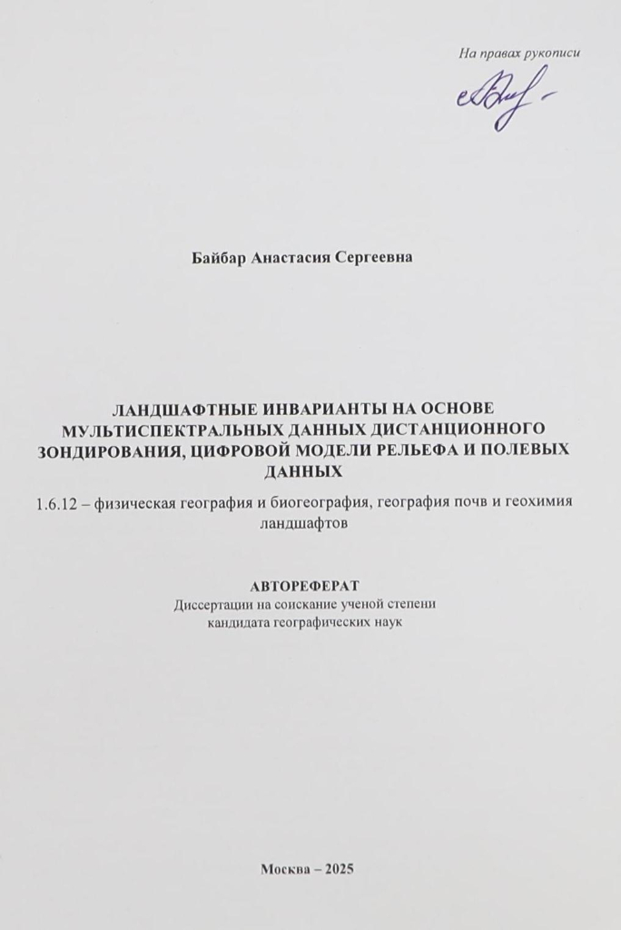 Байбар, Анастасия Сергеевна. Ландшафтные инварианты на основе мультиспектральных данных дистанционного зондирования, цифровой модели рельефа и полевых данных : 1.6.12 - физическая география и биогеография, география почв и геохимия ландшафтов : автореферат диссертации на соискание ученой степени кандидата географических наук / Байбар Анастасия Сергеевна ; Институт географии Российской академии наук, Отдел физической географии и проблем природопользования. - Москва : [б. и.], 2025. - 23 с. : ил., цв. ил. - Библиогр.: с. 23 (4 назв.). - 100 экз. - Текст : непосредственный.