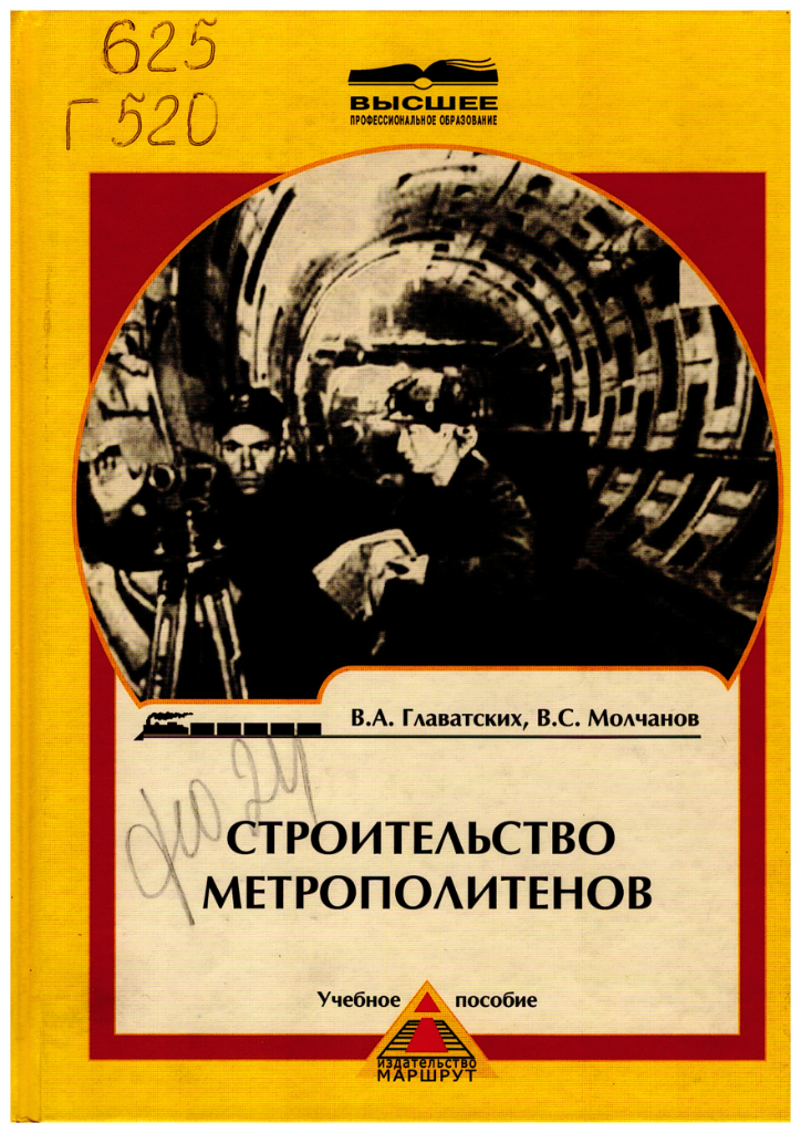 Главатских, В. А. Строительство метрополитенов : учеб. пособие / В. А. Главатских, В. С. Молчанов; под ред. В. А. Главатских. - М. : Маршрут, 2006 (М.). - 679 с. : ил. - (Высшее профессиональное образование). - Библиогр.: с. 655-663 (123 назв.). - 3000 экз. - ISBN 5-89035-364-0 : Б. ц. - Текст : непосредственный.