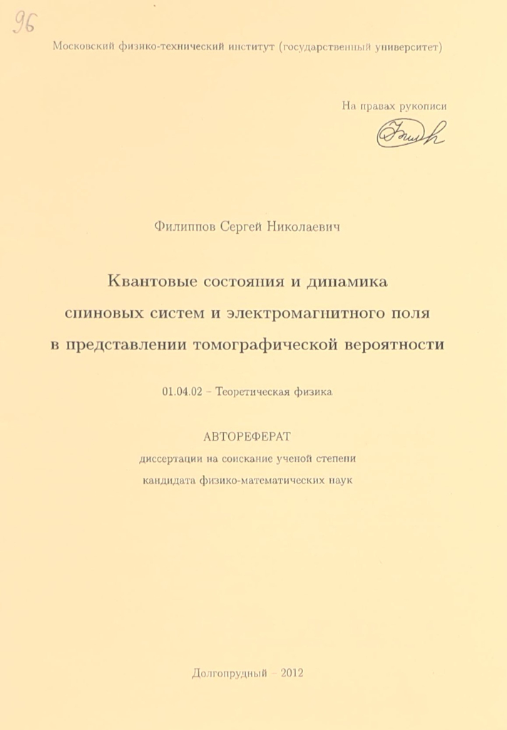 Филиппов, С. Н. Квантовые состояния и динамика спиновых систем и электромагнитного поля в представлении томографической вероятности : автореф. дис. ... канд. физ.-мат. наук : 01.04.02 / С. Н. Филиппов. - Долгопрудный : [б. и.], 2012. - 22 с. : ил. - Библиогр.: с. 19-22 (29 назв.). - Текст : непосредственный.