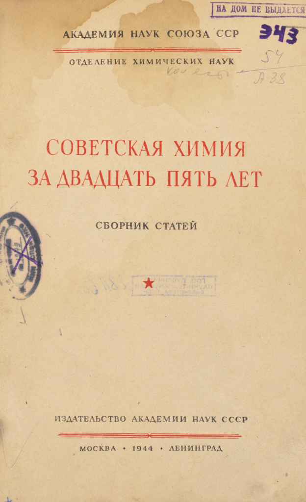 Советская химия за двадцать пять лет = Twenty five years of soviet chemistry : сборник статей / Академия наук СССР, Отделение химических наук ; редакционная коллегия: акад. Н. Н. Семенов (ответ. редактор) [и др.]. - Москва ; Ленинград : Изд-во Академии наук СССР, 1944. - 287, [1] с. : ил. + [7] л. портр. - Библиогр. в конце ст. - 3000 экз. - Текст : непосредственный.